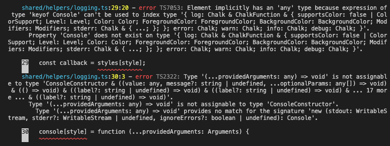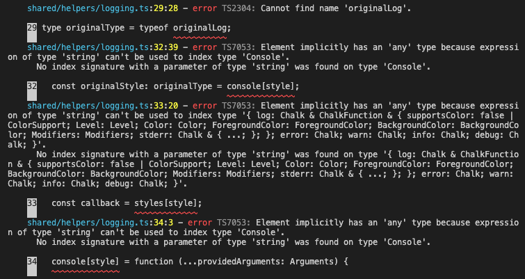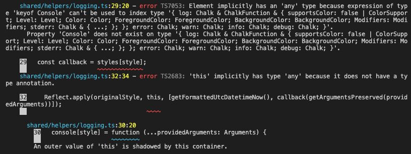 shared/helpers/logging.ts:34:3 - error TS7053: Element implicitly has an 'any' type because expression of type 'string' can't be used to index type 'Console'.