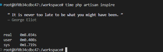 我使用了一个带有php:8.1.6cli的码头容器,并运行了我的laravel乘法器。当我将终端附加到容器并运行一个简单的命令php artisan inspire