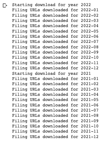 URL下载器在每次处理迭代时将一个新的URL附加到日志文件filing_urls.txt。如果您不小心关闭了应用程序,您可以从最近处理的一年开始,而不必再下载已经处理的URL。