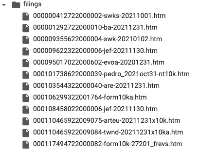 文件下载程序的第二个组件将日志文件filing_urls.txt中的所有10-KURL加载到内存中,并将20个文件并行下载到文件夹filings中。所有文件都下载到同一个文件夹中。