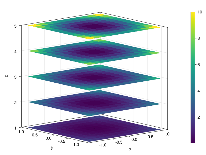 在Julia中,我想在一个图中叠加热图,这就是如何在这个堆栈溢出帖子中使用Matlab完成的:I need a function to display matrices stacked最好对所有热图都有相同的颜色条,并且能够指定每个平面的位置(即沿第三维空间)。