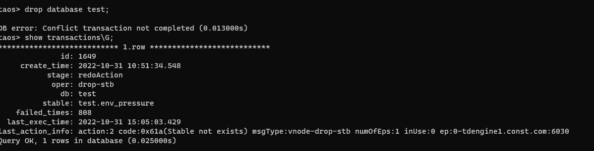 TDengine数据库3.0.1.5,当删除双节点中的超级表时,由于一个节点的磁盘空间已满,因此不会删除超级表(“显示事务”消息是“系统空间外”)。添加空间后,事务仍然无法退出,并显示消息"stb不存在“。