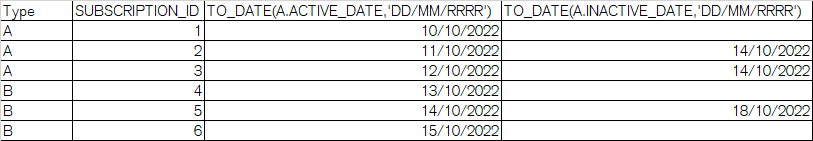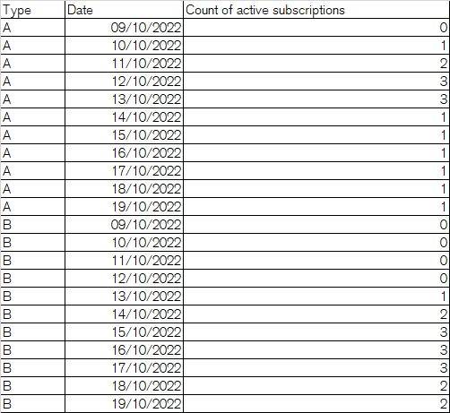 我有一个表显示订阅,列表示活动日期,列显示非活动日期。我需要一个查询,它计算一个日期范围内每个特定日期的活动订阅数。