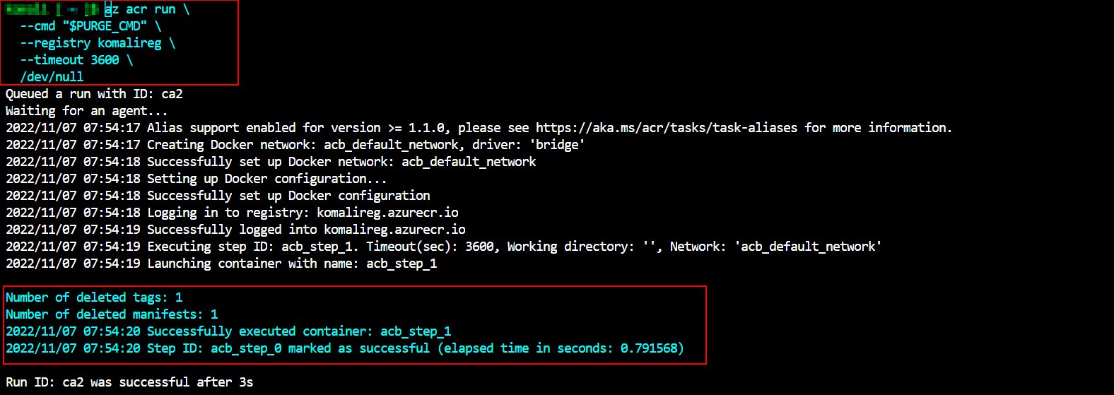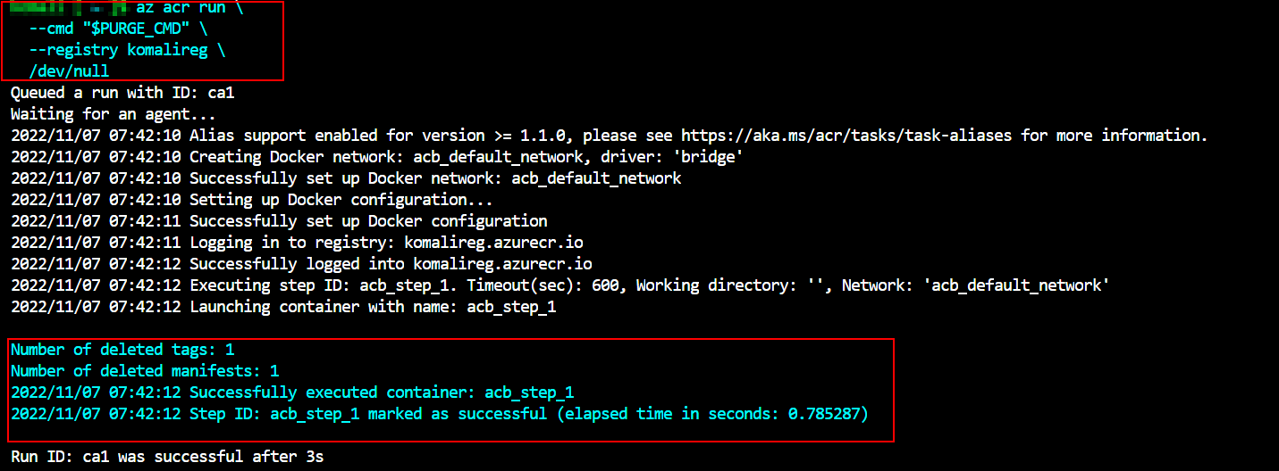 az acr run \ --cmd "$PURGE_CMD" \ --registry <myregistry_name> \ /dev/null