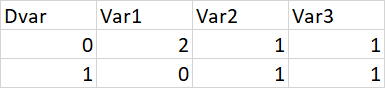 [0,1,1,1]], columns=['Var1', 'Var2', 'Var3', 'Dvar'])