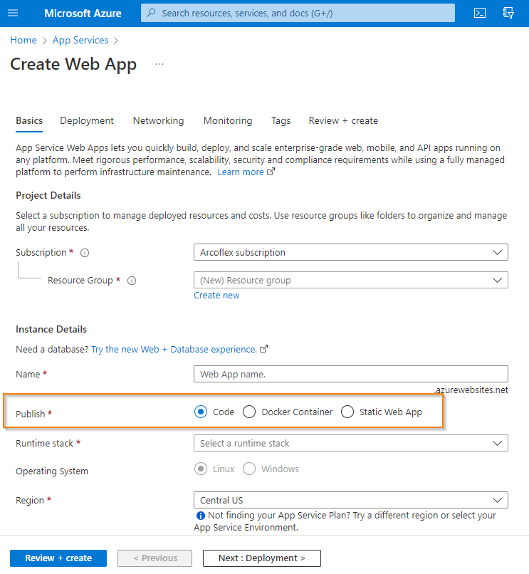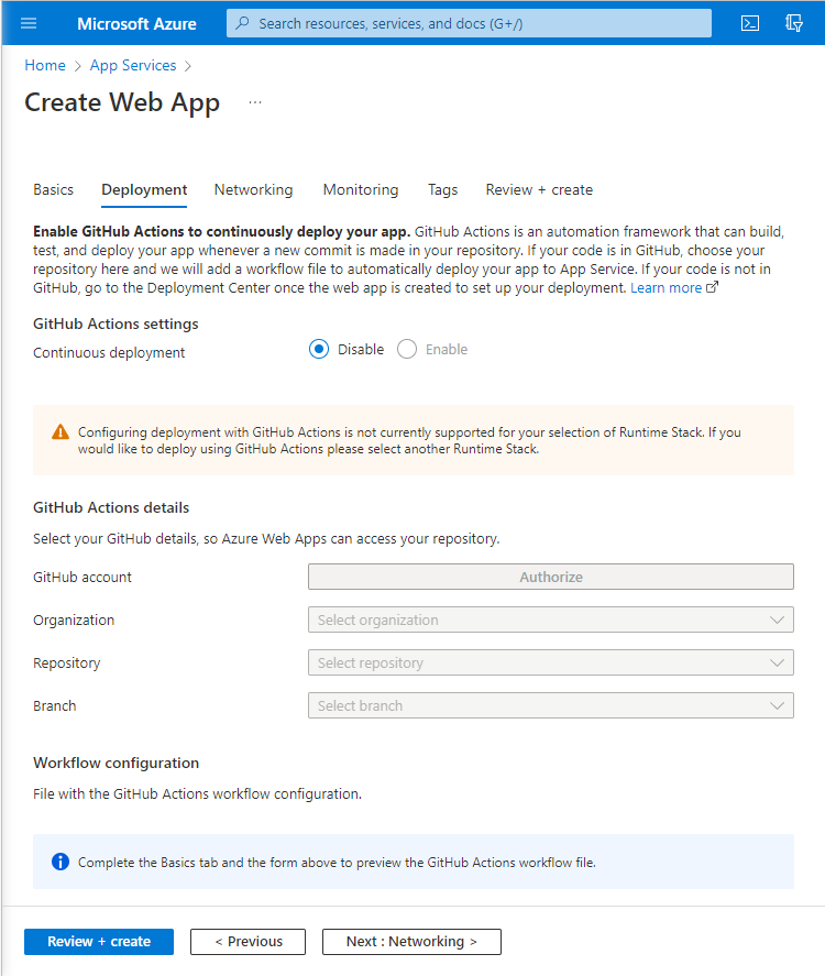 Code用于将web应用程序部署到application中,选择此选项将启用部署选项,这些选项将提供接口,因此您可以选择启用持续集成并订阅GitHub或Azure DevOps存储库中的更改: