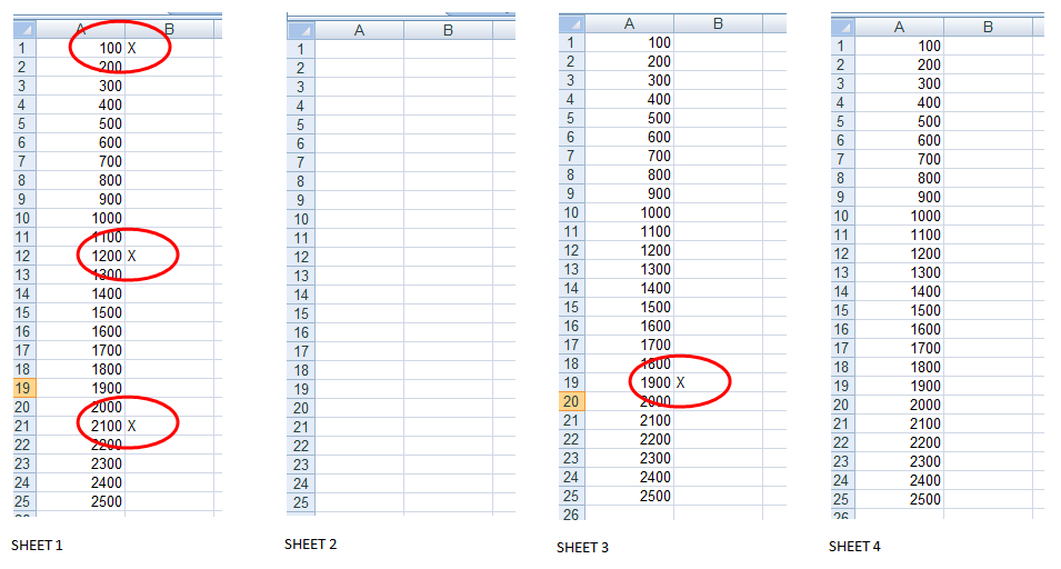 如果B列中有X,则我的代码只返回每个工作表中的行号: