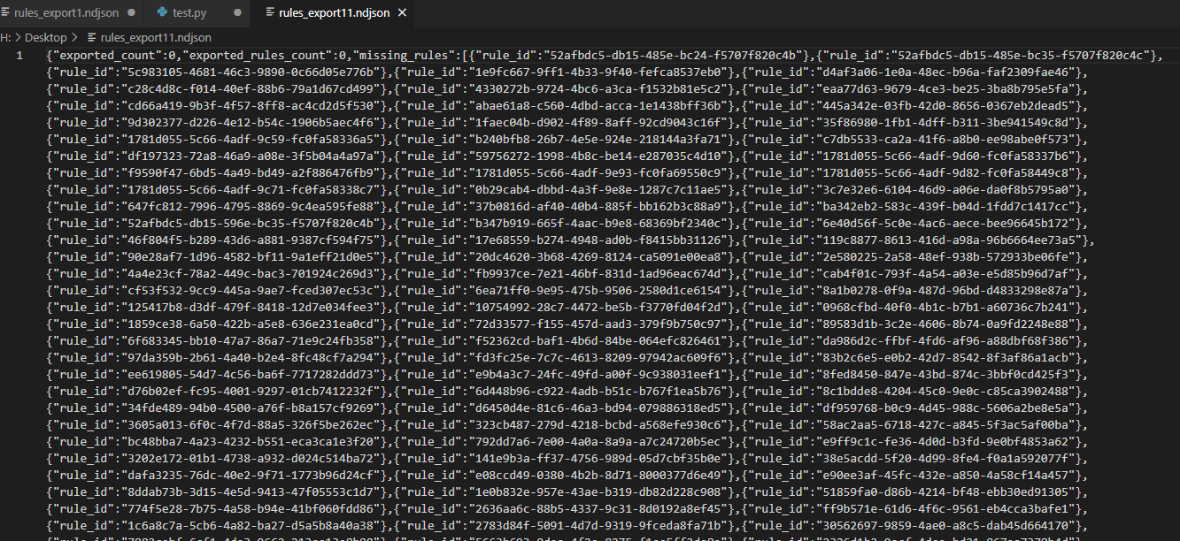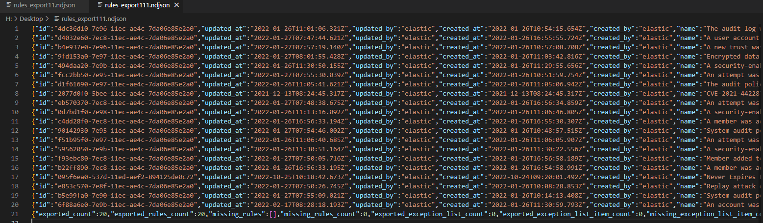 我试图将所有的722规则导出到ndjson文件中,但是文件是不完整的。有两套规则:弹性规则和习惯规则。