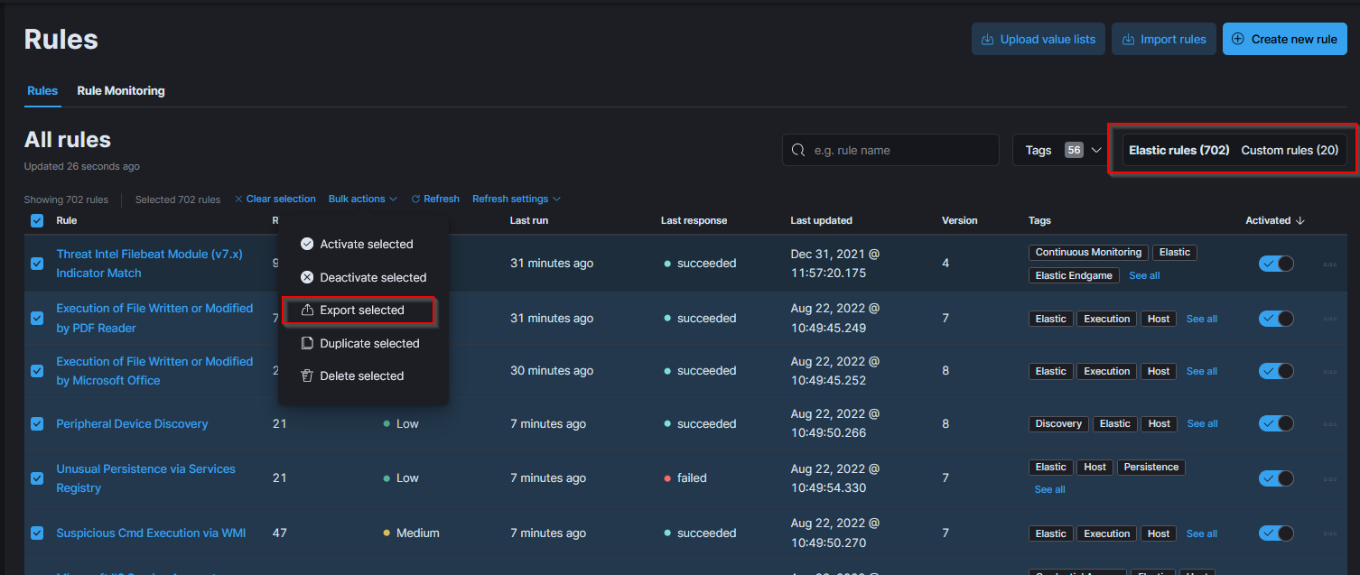 我转到“安全性”>“概述”>“规则”>“选择所有722条规则”>“批量操作”>“导出选定”。