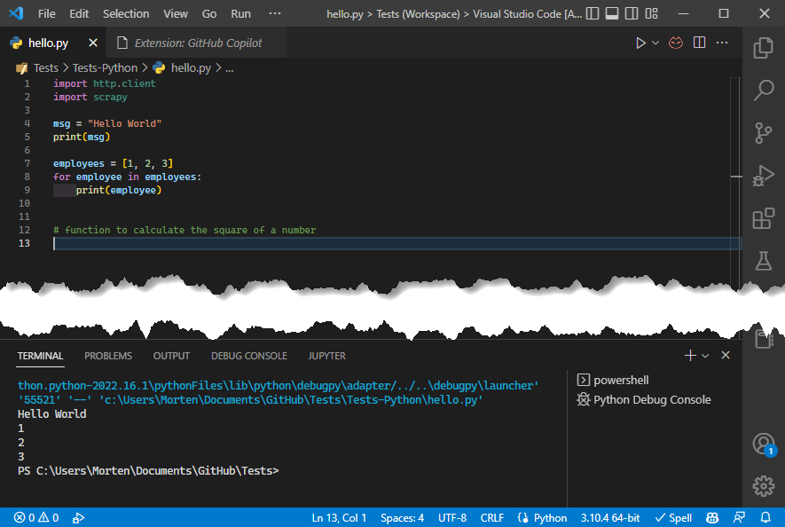 我可以在vs代码中运行python (.py),而CoPilot可以很好地处理Powershell脚本(.ps1),但是,我没有收到任何Github的建议。副驾驶图标显示,插件似乎被激活。