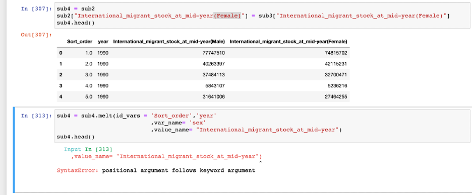我试着把数据融为一体,把性别和移民区分开来。我认为我的代码看起来很好,但它总是给我语法错误。有人知道怎么修吗?