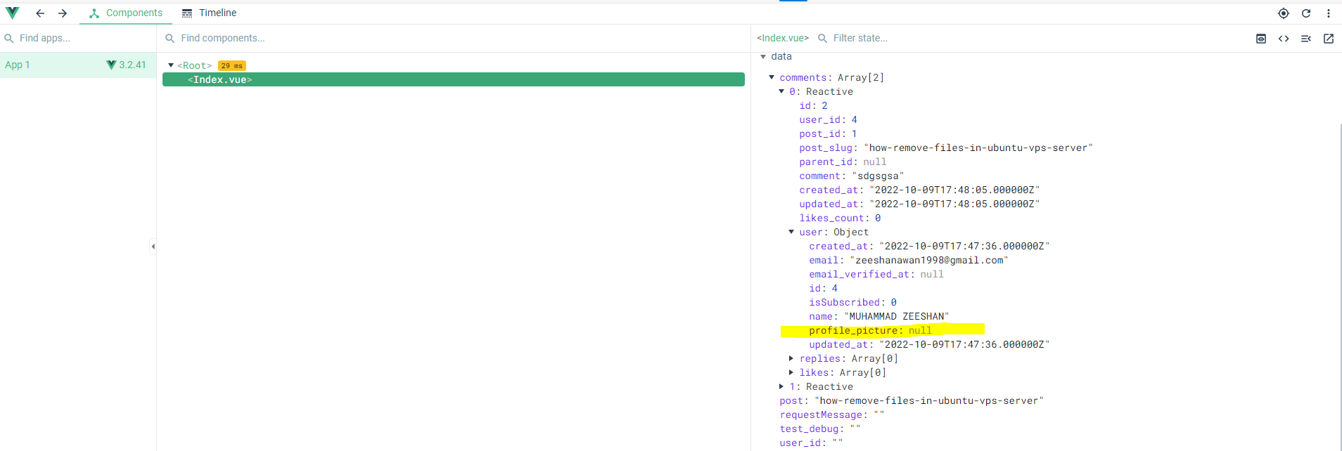 在我的Laravel项目的vue.js组件中出现了这个错误,它说profile_picture在对象中有一个空值,但是我也对此进行了检查。