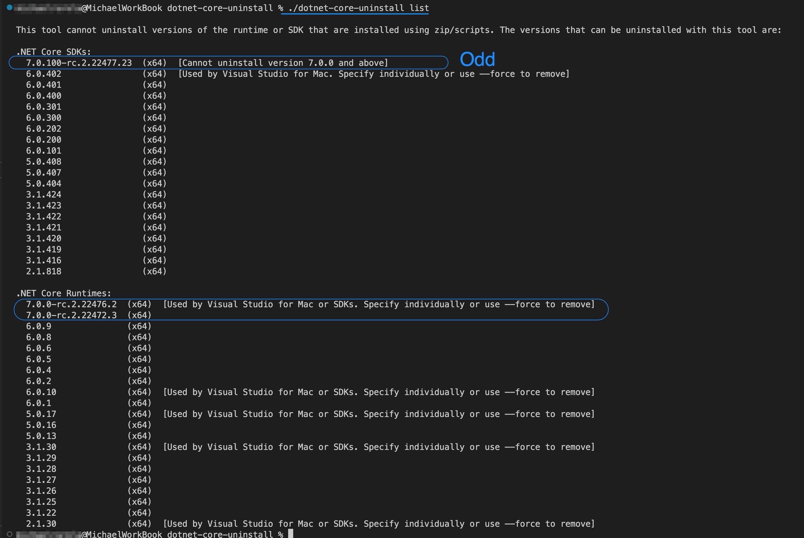 michael@MichaelWorkBook dotnet-core-uninstall % ./dotnet-core-uninstall dry-run --sdk 7.0.100-rc.2.22477.23