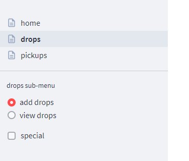 st.sidebar.radio('drops sub-menu', options=['add drops', 'view drops'])