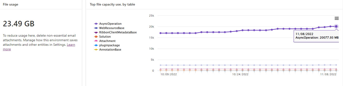 我刚开始管理MS Dynamics。它在网上,而不是在-prem。今天早上我接到通知说,一位租户已经超过了我们30 of的存储容量。查看一下对那个租户的数据厌恶,我可以看到20 is的文件存储是AsyncOperations。看看如何大容量删除这一点,我可以看到,我们的作业设置为大容量删除已完成的系统作业,所以这是排序的。再看一看,我找到了一些指南,说明这是一种工作流的系统作业类型。但是,当我创建大容量删除作业和预览记录时,系统作业类型工作流的值为0。对于如何清除一些AsyncOperation存储,有什么想法吗?