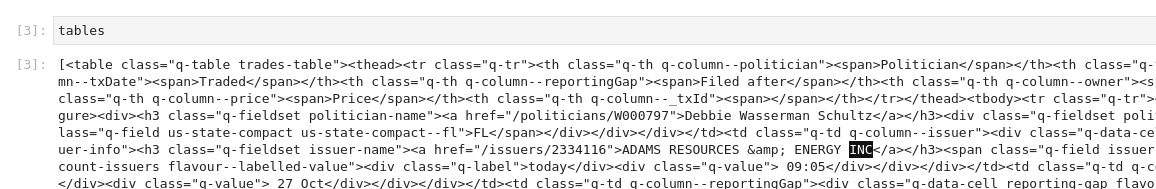 我想从国会贸易那里刮掉国会的股票交易。我可以抓取数据,但是包含股票代码的列有一个span标记,它将公司名称与公司代码分隔开来。pandas.read_html()删除了这个span标记,它连接了公司名称和代码,并且很难恢复代码。
