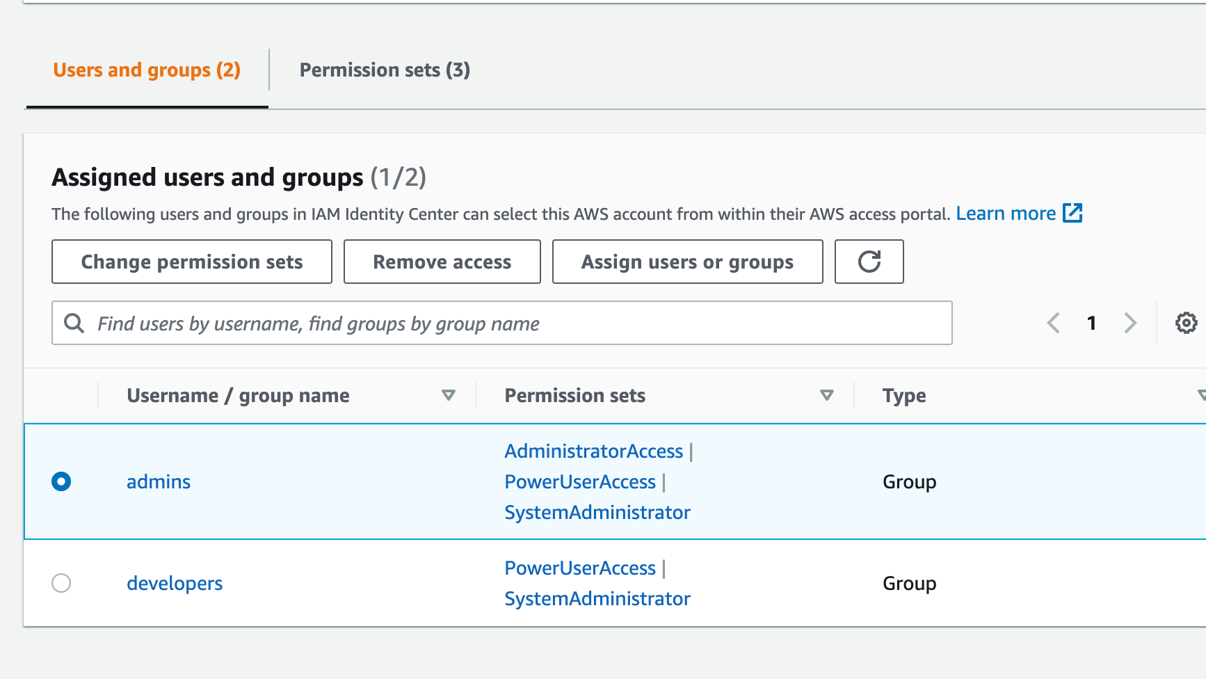 使用标识中心,我将权限集分配给帐户,然后将用户/组分配给帐户。