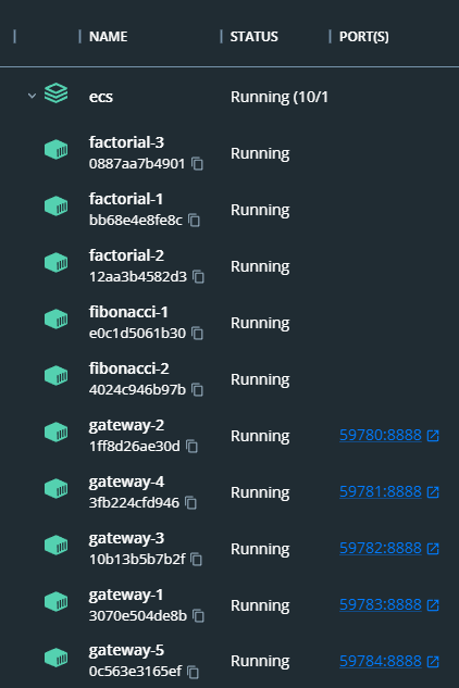 现在我有3个阶乘容器、2个fibonacci容器和5个具有不同端口的网关容器。每个网关容器都可以访问一些阶乘/fibonacci副本,但我需要指定网关的一个端口。