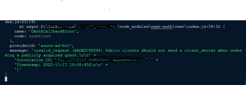 问题是,我已经集成了蓝色广告b2c使用下一个auth软件包。它抛出我在这里附加的代码挑战错误。