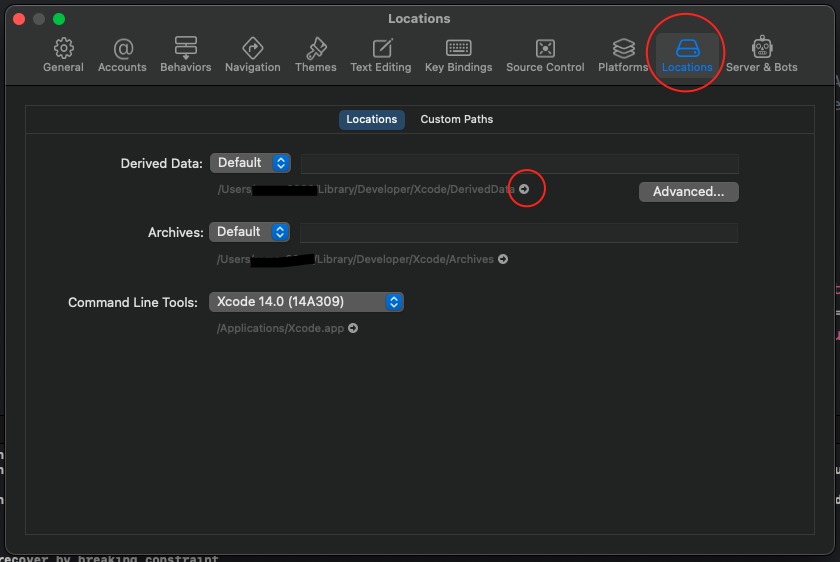 要删除derived data,Goto首选项(CMD+,)> Locations > DerivedData路径