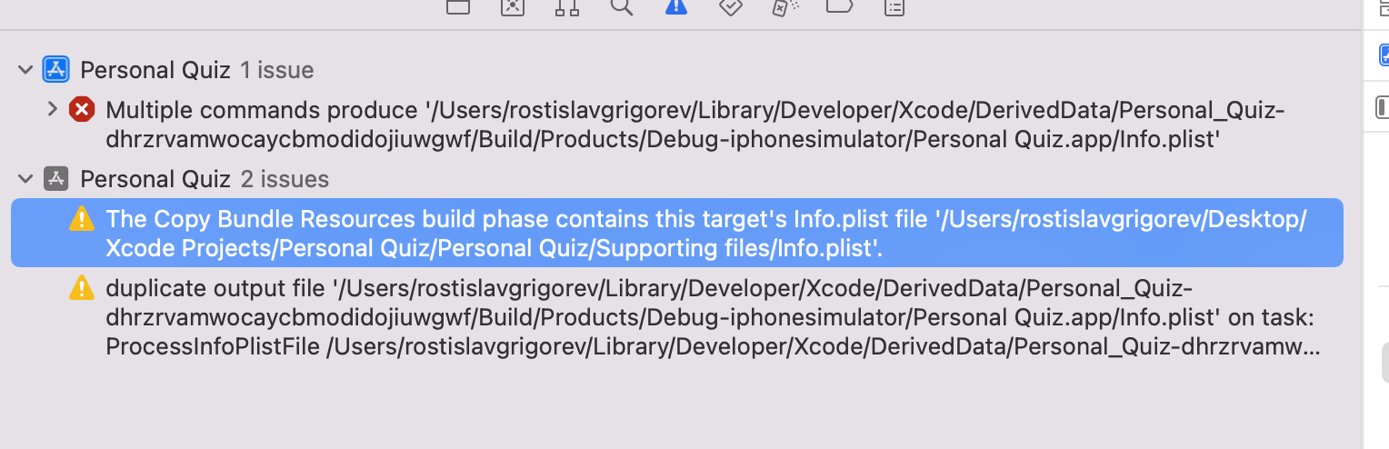 转到您的Bundle settings -> Open Target -> Open Build Phases >展开Copy Bundle Resources,并从那里删除info.plist。