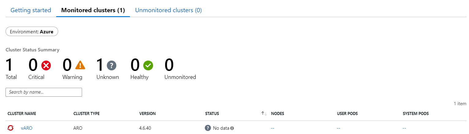 如下图所示,我在中安装了一个ARO集群,但是没有报告任何数据(没有节点,没有pods..etc)。我已经使用DeamonSet在openshift中部署了Oms代理,并且我可以在Log工作区中看到代理(Pods)发送的心跳。在Azure Container中,请您帮助正确地安装ARO集群,好吗?谢谢。