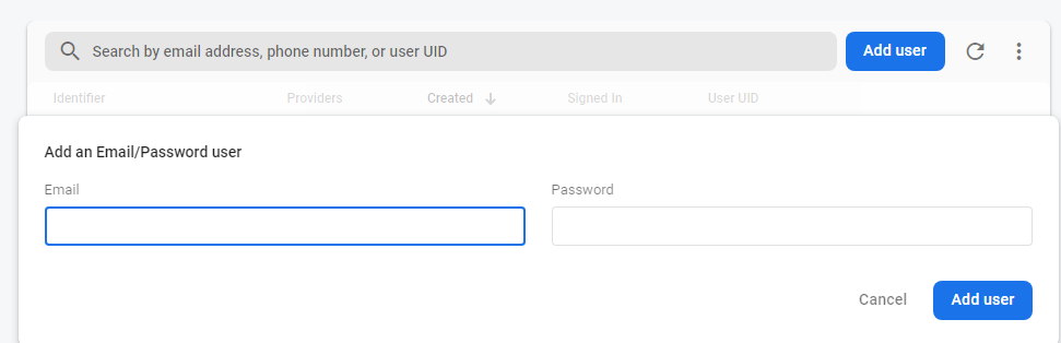 然后,只需点击“添加用户”按钮。您必须在Firebase上激活用户/密码提供程序。