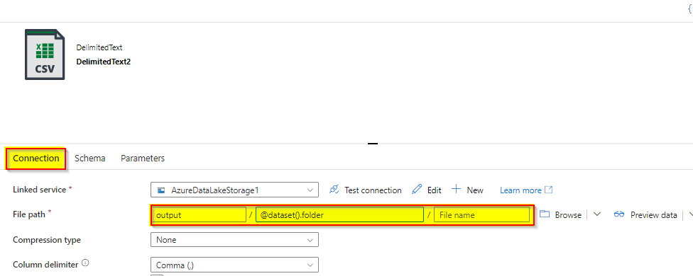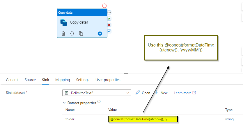 遵循Sink dataset部分,从Dataset复制Sink section....remove参数sinkfilename,并在复制活动中使用此数据集作为源。