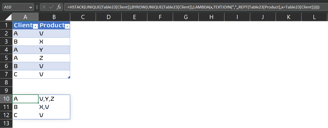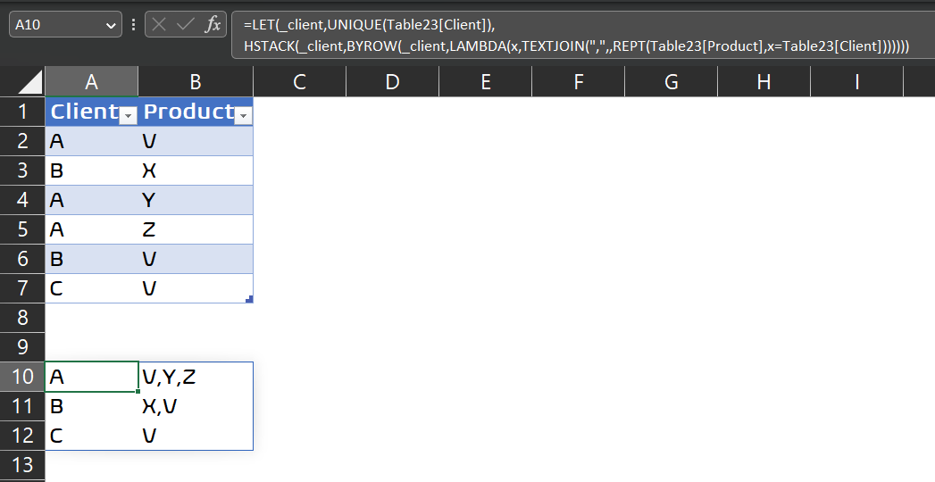 =HSTACK(UNIQUE(Table23[Client]),BYROW(UNIQUE(Table23[Client]),LAMBDA(x,TEXTJOIN(",",,REPT(Table23[Product],x=Table23[Client])))))您可以将整个过程封装在一个LET()中,使其更具可读性,如下所示,