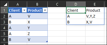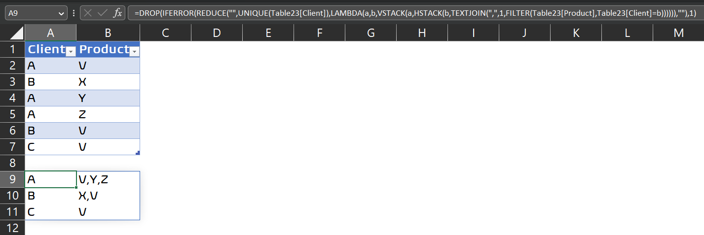 =REDUCE(Table1[#Headers],UNIQUE(Table1[Client]),LAMBDA(a,b,VSTACK(a,HSTACK(b,TEXTJOIN(",",,FILTER(Table1[Product],Table1[Client]=b))))))https://stackoverflow.com/questions/74605791