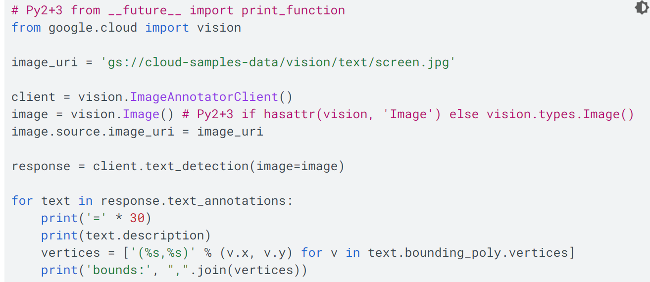 --如果您打算打开您可以访问在这里提到的引用中提供的图像示例的映像:https://storage.cloud.google.com/cloud-samples-data/vision/text/screen.jpg --代码中提供的uri是存储在Google中的图像的资源位置,上面的链接相当于url。