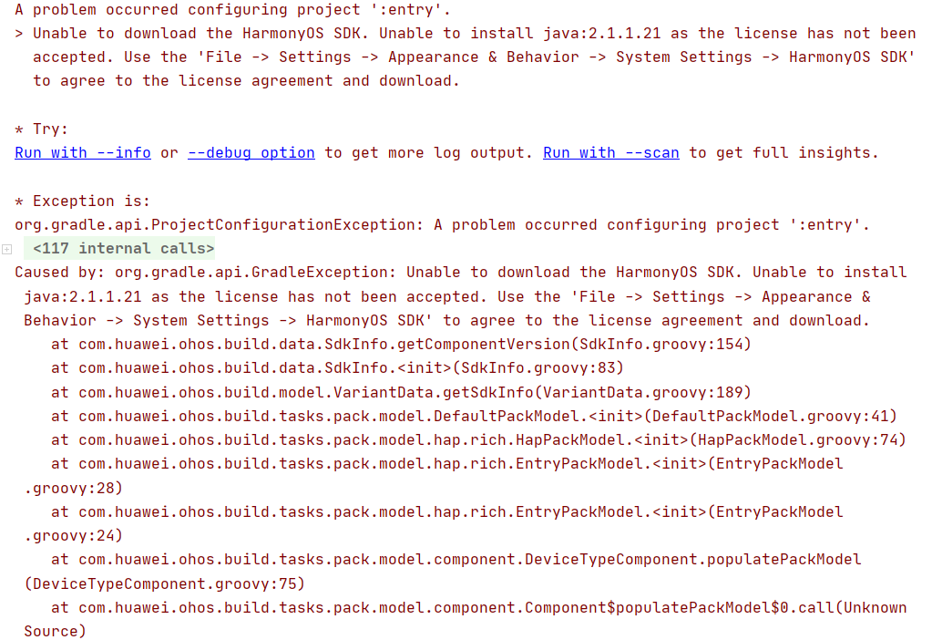 Unable to download the HarmonyOS SDK. Unable to install java:2.1.1.21 as the license has not been accepted. Use the 'File -> Settings -> Appearance & Behavior -> System Settings -> HarmonyOS SDK' to agree to the license agreement and download.