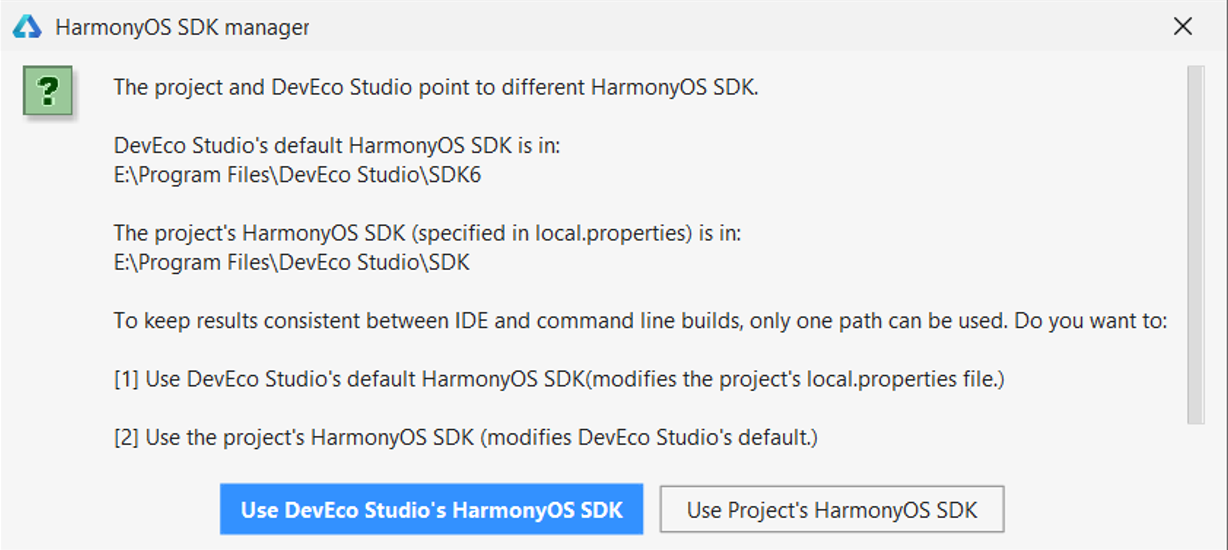 现在,当我尝试用SDK 5打开一个项目时,DevEco问我下面这个-