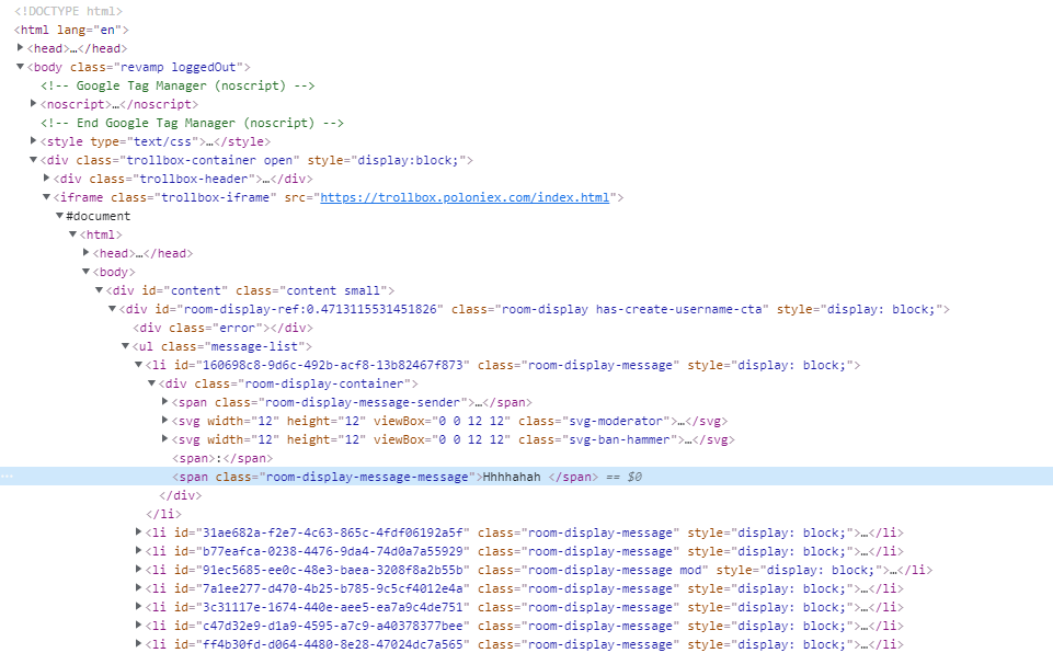 我正在尝试读取高亮显示的行的innertText (请注意这是一个动态网站,因此"li id‘s“更改)。当我在document.querySelector("#\\31 60698c8-9d6c-492b-acf8-13b82467f873 > div > span.room-display-message-message")控制台中触发DevTools,同时高亮显示上面快照中的行时,会返回innerText,但是当我将所选内容移到树的更高的位置时,例如"iframe =“trollbox”,然后运行相同的脚本,它将返回"null“。