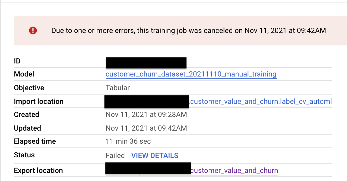我在顶点AI上训练了AutoMl分类模型,不幸的是,模型不适用于批预测,每当我试图在顶点AI上获得训练数据集(与成功的模型训练所用的相同)时,就会得到以下错误: