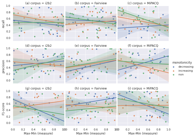 g=sns.lmplot('x', 'y', data=test_plot, col='corpus', hue = 'monotonicity', row='measure', sharey=True, sharex=True, height=2.5,aspect=1.25, truncate=False, scatter_kws={"marker": "D", "s": 20})