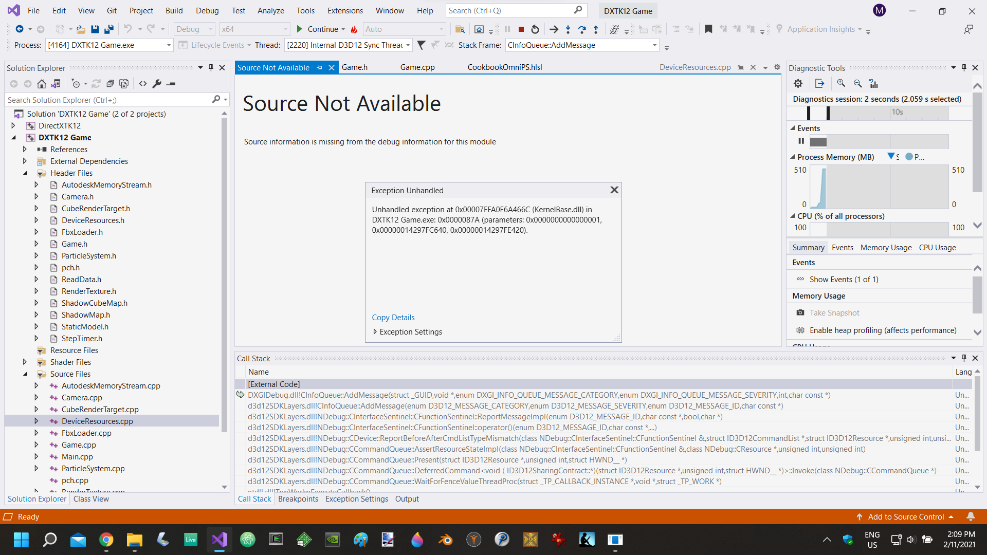 Exception thrown at 0x00007FFA0F6A466C (KernelBase.dll) in DXTK12 Game.exe: 0x0000087A (parameters: 0x0000000000000001, 0x00000014297FC640, 0x00000014297FE420).