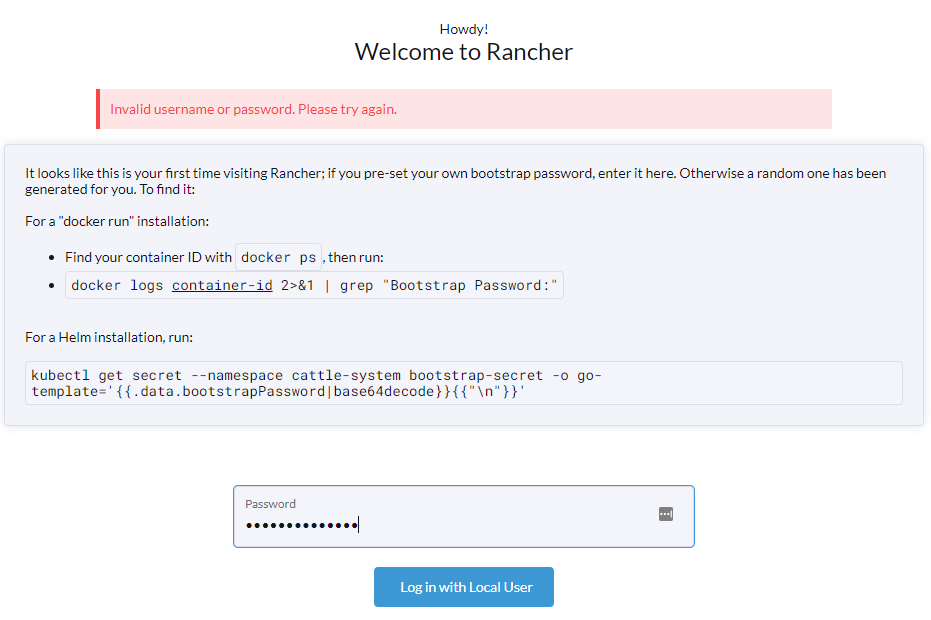 helm install rancher rancher-latest/rancher --namespace cattle-system --set hostname=rancher.mydomain.com --set replicas=1 --set ingress.tls.source=secret --set bootstrapPassword=someRandomPasswordRancher安装成功,当我在rancher.mydomain.com打开页面时,它显示了管理登录页面。我尝试了我在前面的命令中使用的密码,但它无法登录。我一直在以下屏幕截图中发现错误: