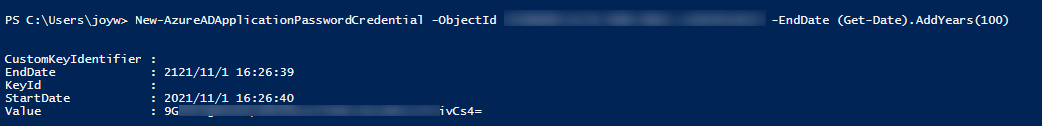 登录,然后在下面作为New-AzureADApplicationPasswordCredential