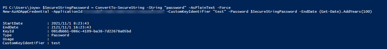 New-AzADAppCredential -ApplicationId <ApplicationId of the App Registration> -CustomKeyIdentifier "test" -Password $SecureStringPassword -EndDate (Get-Date).AddYears(100)