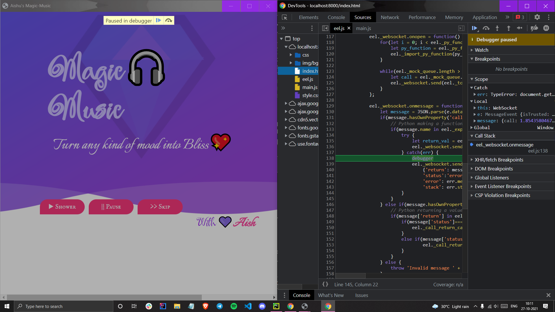 描述了我试图调用JavaScript函数时遇到的问题,但只有当if条件在JavaScript中计算为True时才会这样做。我正在用player和Eel开发一个音乐播放器项目,我想调用JS函数来自动更改歌曲封面图像,而不需要在前面的歌曲结束时点击按钮,在我想调用'eel.fine()‘的时候,在python中使用eel.fine(),但是我确定它为什么不能工作,或者如何作为Eel的新手来完成这个任务。
