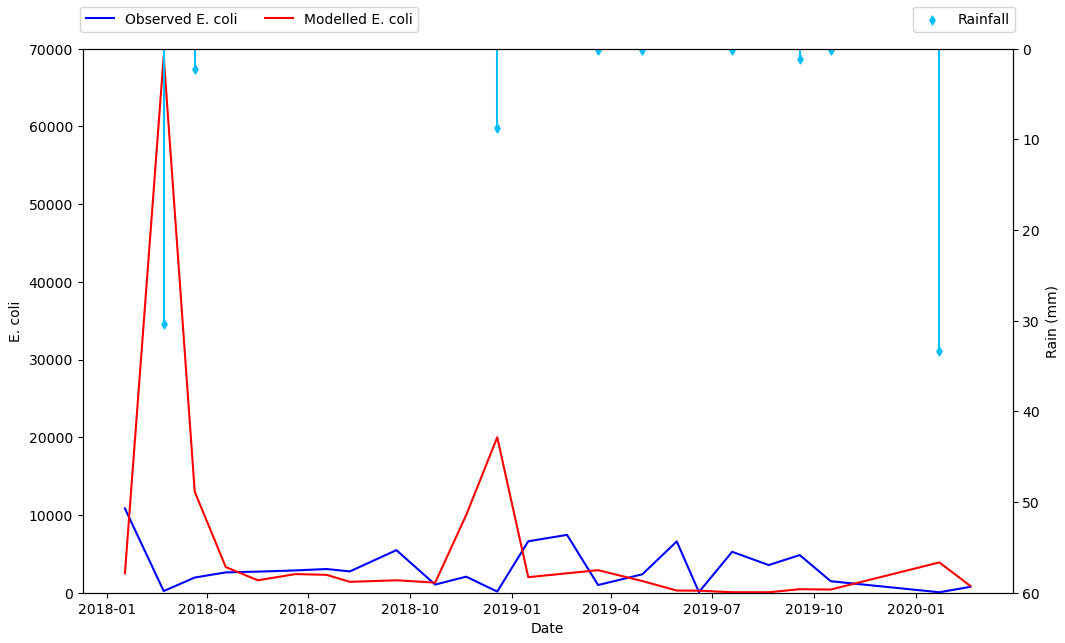 ax.legend(['Observed E. coli', 'Modelled E. coli'], loc='upper left', ncol=2, bbox_to_anchor=(-.01, 1.09))