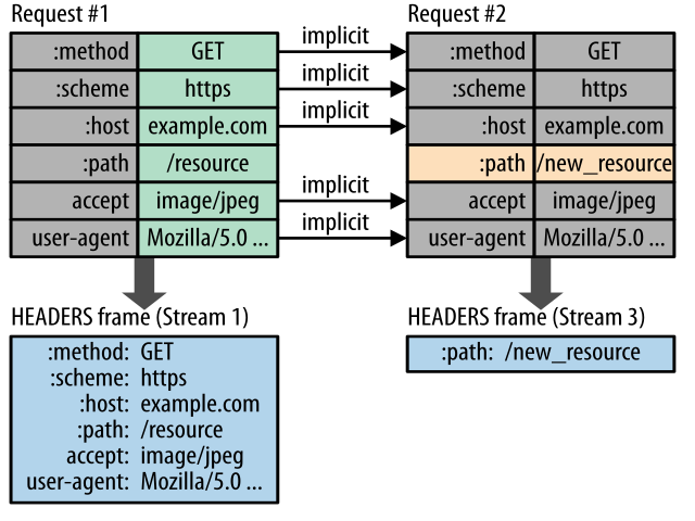 HTTP/2尽量减少有效负载大小。它还将压缩与前一个请求中发送的标头相等的标头和带头,如链接图像的右侧所示。