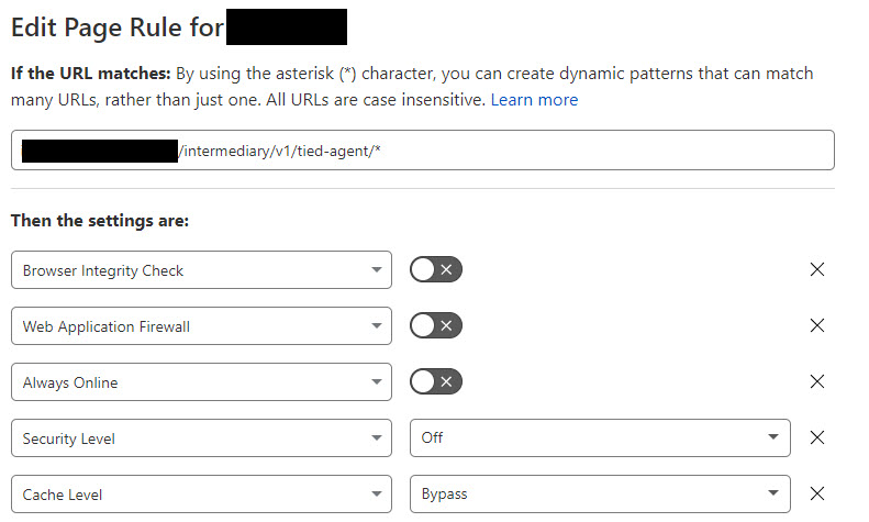 如果您的目标是避免缓存API调用,那么上面的页面规则看起来是正确的。您正在使用一个Cache Level指令来Bypass缓存逻辑。