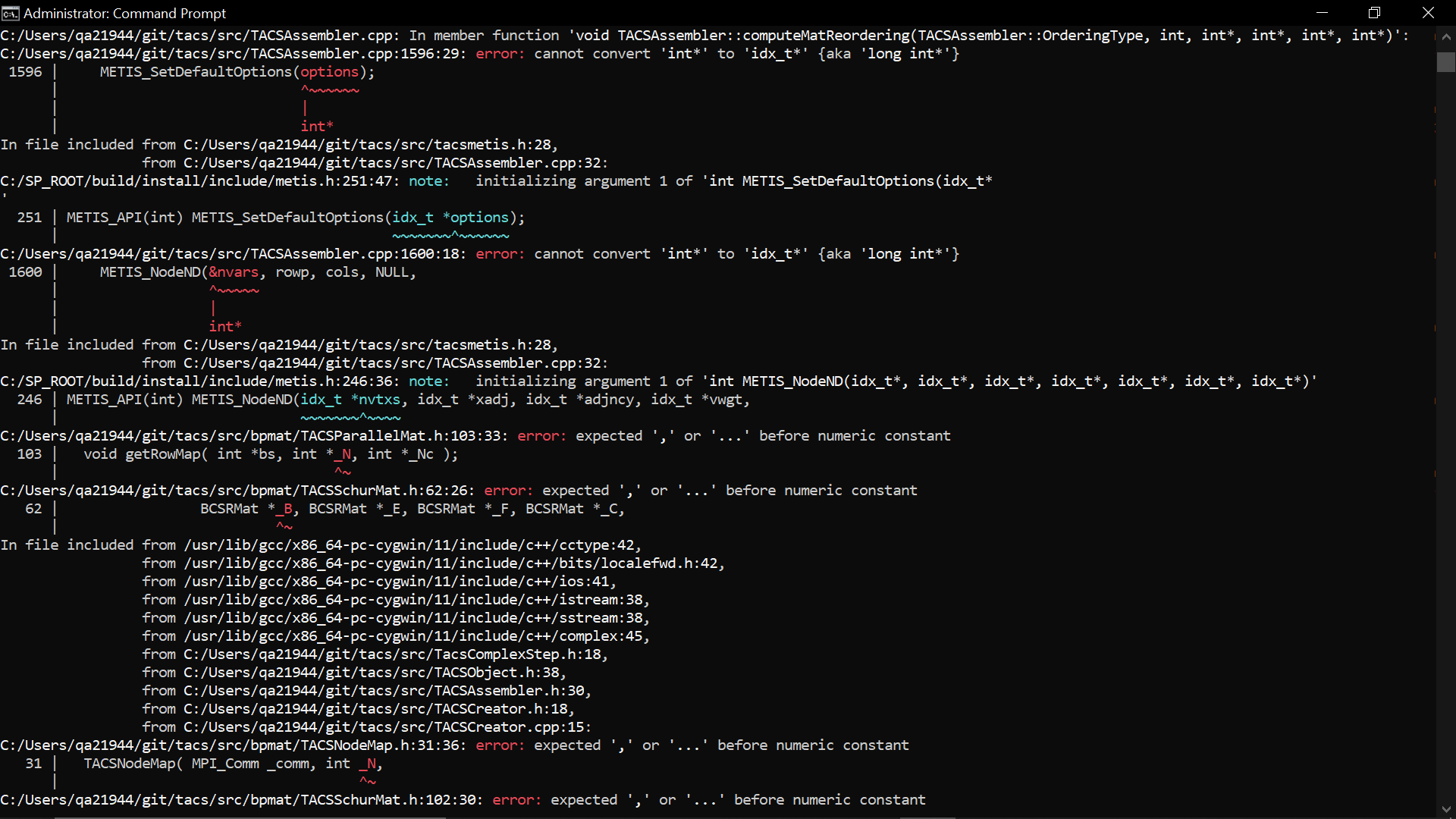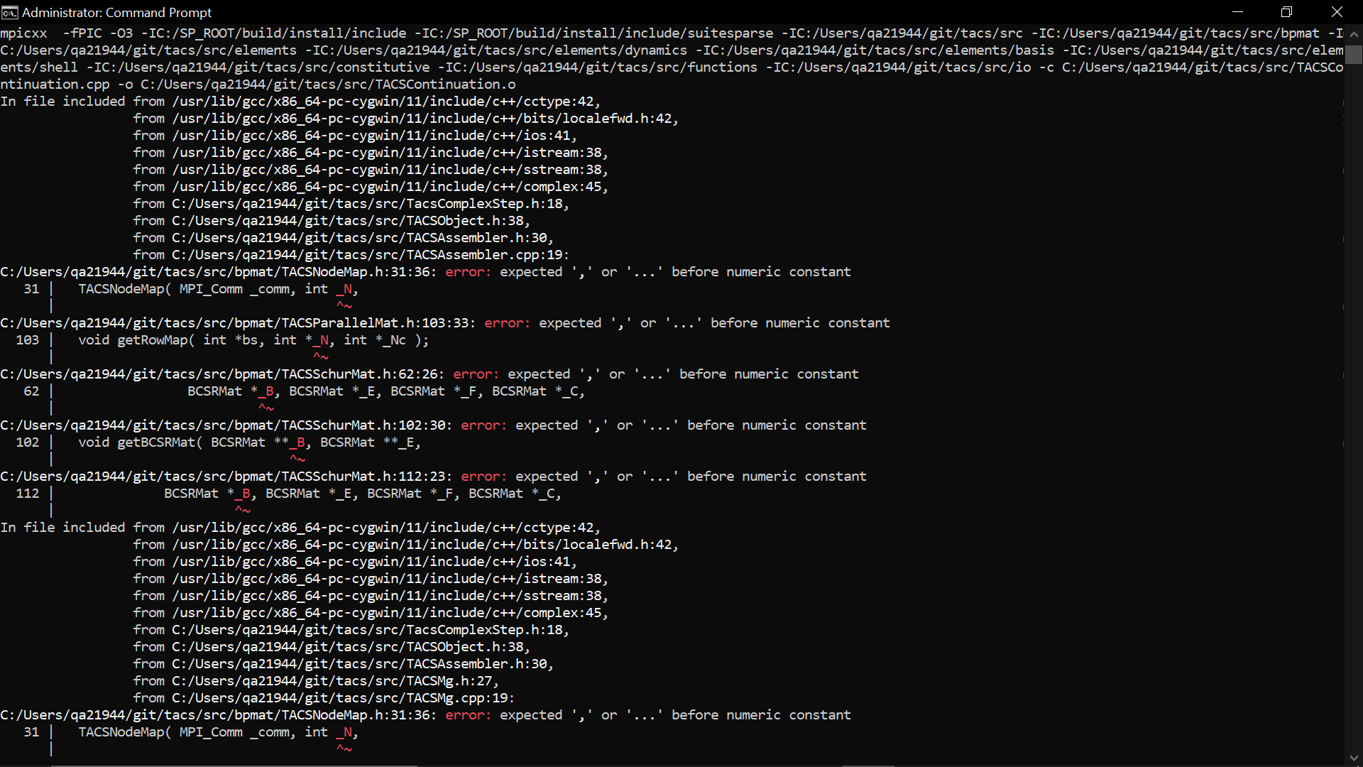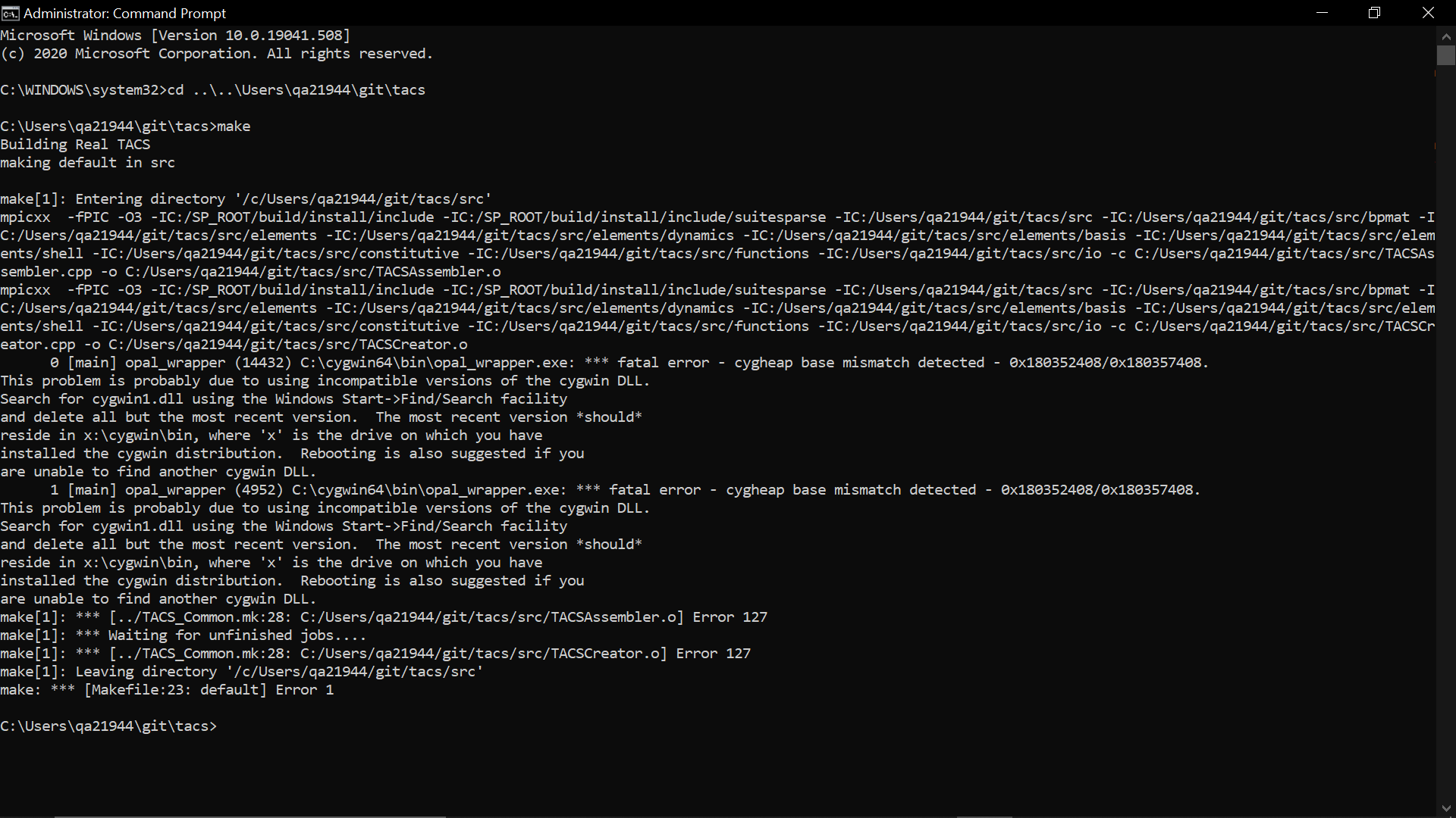 以管理员身份运行Windows提示符,C:\cygwin64\bin位于PATH环境变量的顶部,我在TACS基本目录中键入了make,并得到了三种类型的错误:
