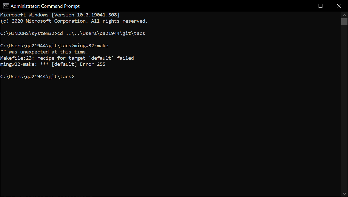 以管理员身份运行Windows提示符,C:\msys64\usr\bin位于PATH环境变量的顶部,我在TACS基本目录中键入了make,并得到了