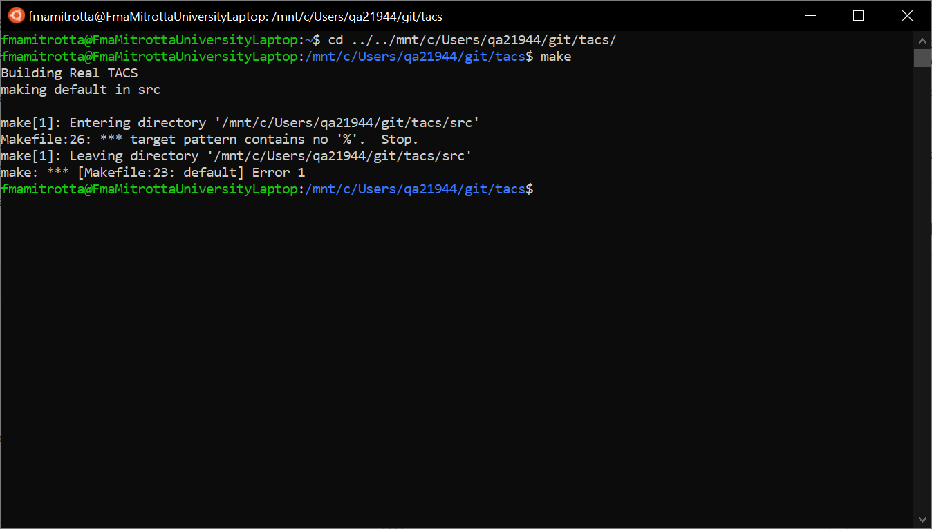 这一尝试是受这个答案的启发。我从Microsoft下载了Ubuntu并安装了make。在Ubuntu中,我在TACS基本目录中输入了make,并得到了