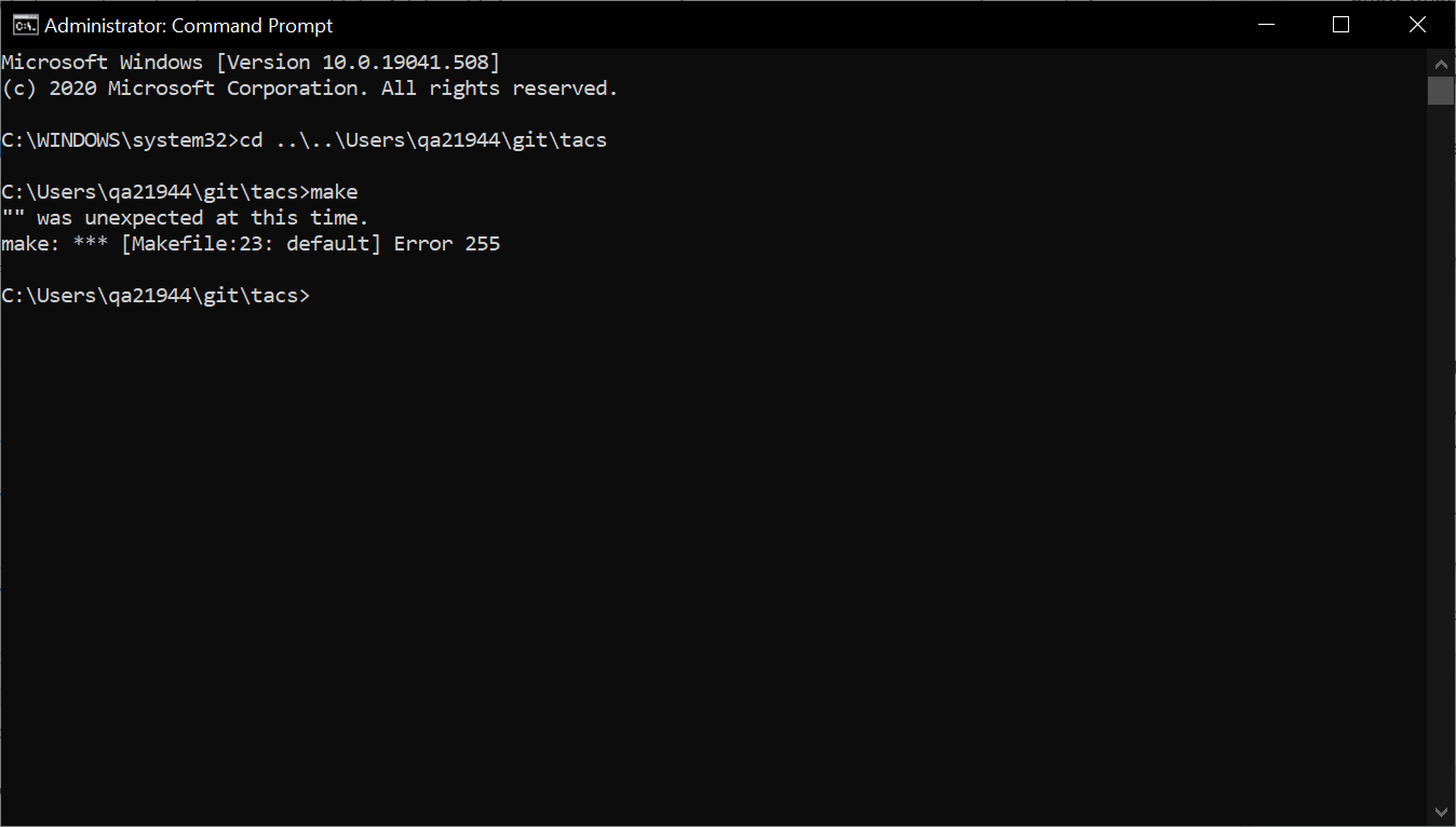 以管理员身份运行Windows提示符,C:\ProgramData\chocolatey\bin位于PATH环境变量的顶部,我在TACS的基本目录中输入了make,得到了