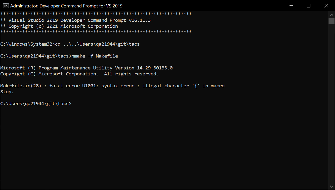以管理员身份运行VS 2019年的Developer命令提示符,我在TACS的基本目录中键入nmake -f Makefile,得到Makefile.in(28) : fatal error U1001: syntax error : illegal character '{' in macro Stop.