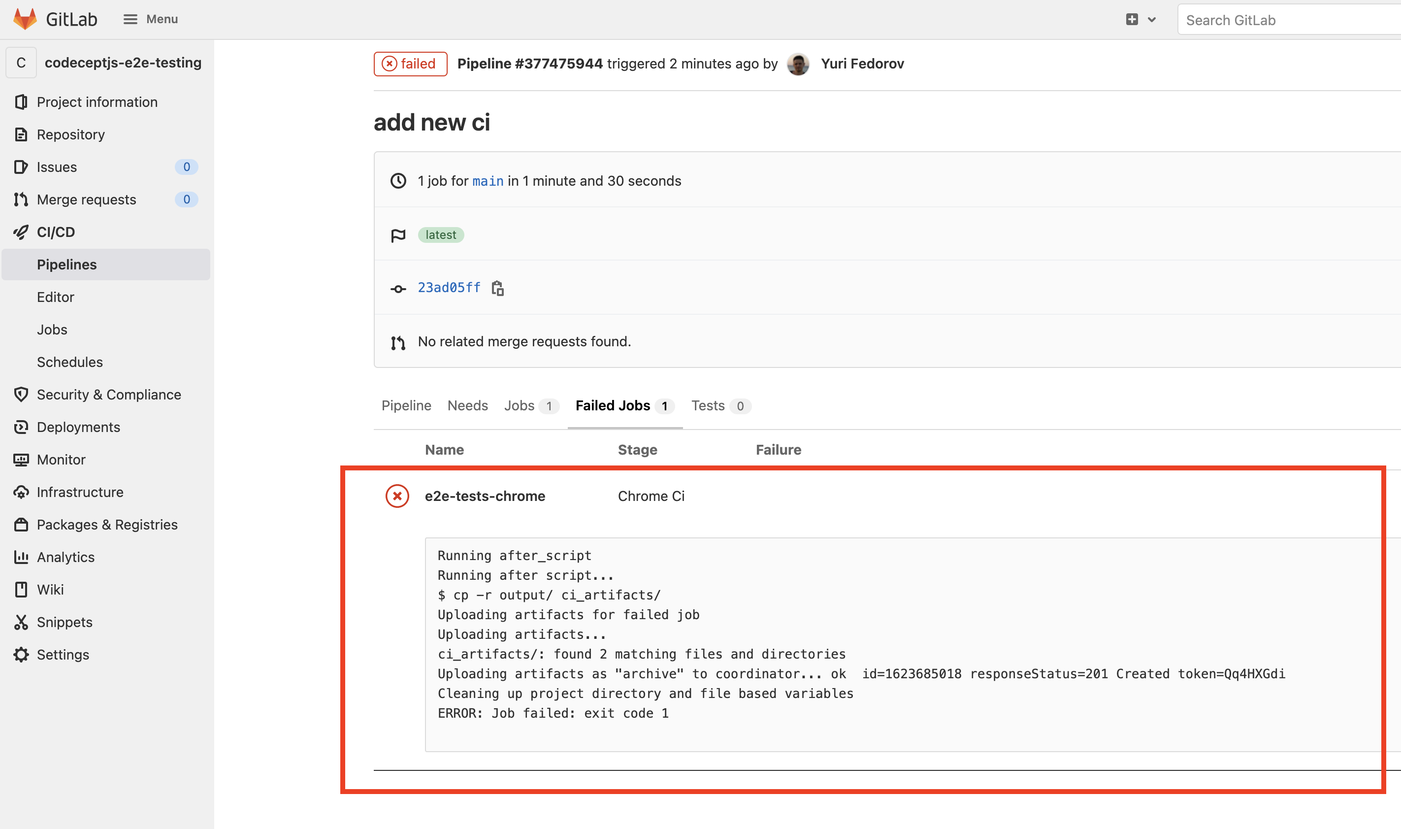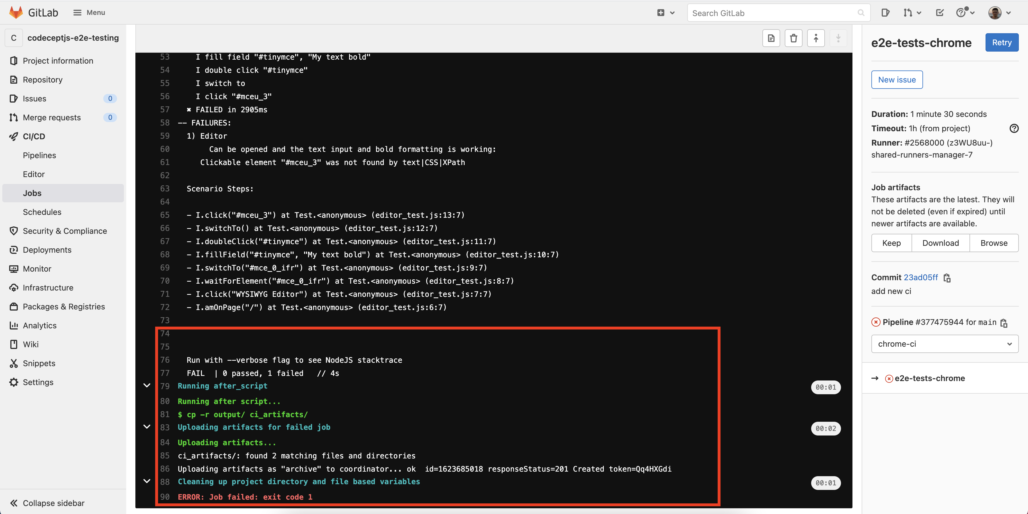 看起来您没有遇到GitLab的问题,因为您有一个失败的测试。在映像的第77行,它显示了基于找不到mceu_3 id的测试失败。一旦解决了该测试,您的工作就应该成功完成。